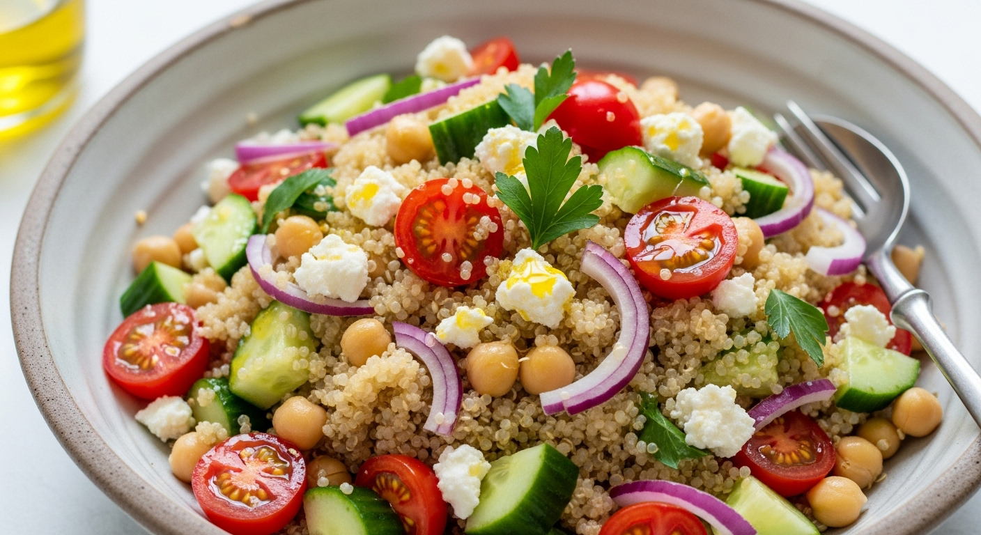 In a large bowl, combine cucumber, cherry tomatoes, and red onion.